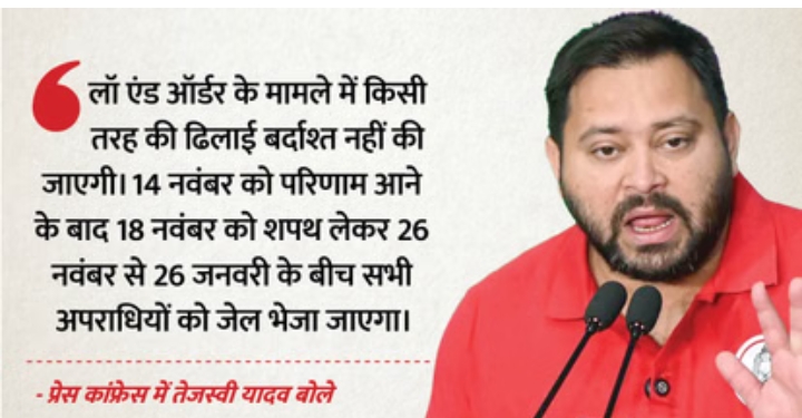 बिहार विधानसभा चुनाव के प्रचार अभियान में राजद नेता तेजस्वी यादव ने कई बड़े वादे किए हैं। उन्होंने कहा कि अगर महागठबंधन की सरकार बनती है, तो 14 जनवरी को महिलाओं के खाते में 30 हजार रुपये भेजे जाएंगे। साथ ही जीविका दीदीयों का ब्याज माफ किया जाएगा और उन्हें 30 हजार रुपये की सहायता राशि दी जाएगी। तेजस्वी ने ओल्ड पेंशन स्कीम लागू करने, किसानों के लिए फ्री बिजली, और ‘बेटी योजना’ व ‘मां योजना’ शुरू करने का भी ऐलान किया। उन्होंने कहा कि राज्य में हर घर को सरकारी नौकरी देने की दिशा में काम किया जाएगा। कानून-व्यवस्था पर सख्त रुख अपनाते हुए तेजस्वी ने कहा कि लॉ एंड ऑर्डर के मामले में किसी तरह की ढिलाई बर्दाश्त नहीं की जाएगी। उनका दावा है कि 14 नवंबर को परिणाम आने के बाद 18 नवंबर को शपथ लेकर 26 नवंबर से 26 जनवरी के बीच सभी अपराधियों को जेल भेजा जाएगा। साथ ही उन्होंने केंद्र पर हमला करते हुए कहा कि “उत्तर प्रदेश में दीपावली पर सिलेंडर फ्री करने की गारंटी कहां गई?” अब बिहार की जनता झूठे वादों में नहीं फंसने वाली है।